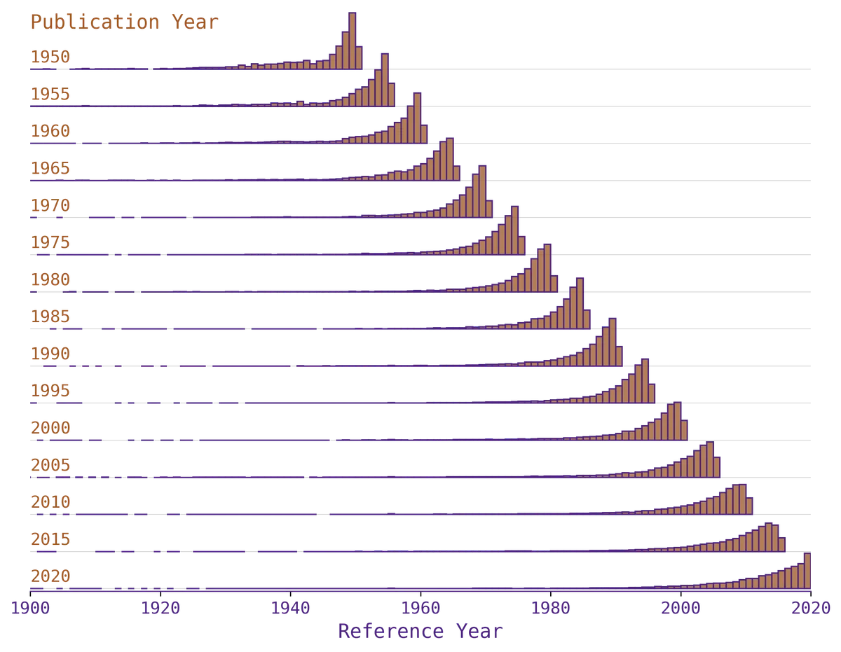 Functionally inelegant code handled: the API's limits of submitting 50 DOIs at a time; appending lists to other lists; and gracefully keeping track of records returned that didn't have any references listed[8]. Follow this up with a bit of wrangling[9] to get the results into a nice dataframe with one row for each referenced paper, and columns: pub_year & ref_year. Next step: get the distribution of referenced publication dates, grouped by pub_year.