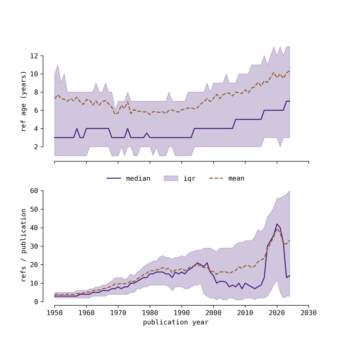 In recent years, it seems, the the median age of a reference has increased from 3 in the 1990s to 6 in the late 2010s (Fig 1). And the number of references included has swollen, following a post-millennium dip[12].